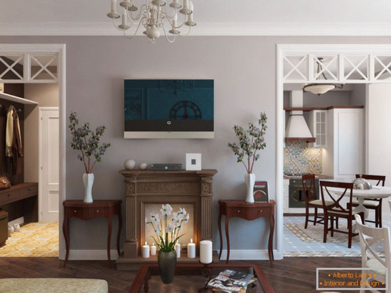 Modern szoba vidéki stílusban egy közönséges városi lakás belsejében.