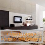 Cozy moduláris kanapék a nappali belsejében minimalizmus stílusában. A tágas, moduláris kialakítások egy tágas nappali szelídségét simítják.